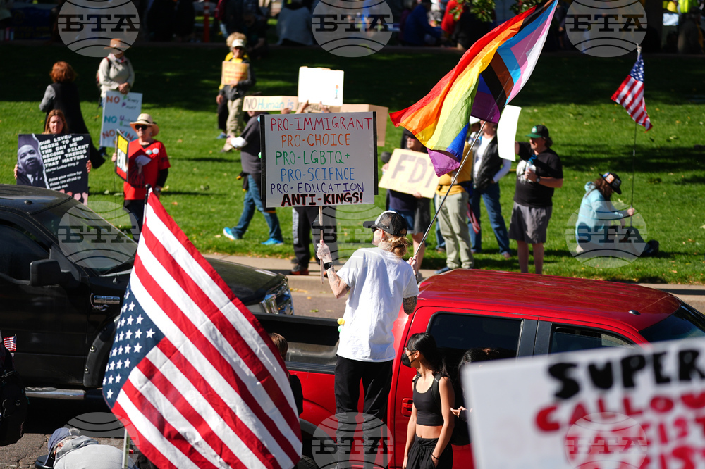 People hold up signs during a "No Kings" protest Saturday, Oct. 18, 2025, in Denver. (AP Photo/David Zalubowski)