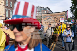 Demonstrators carry a signed banner representing the U.S. Constitution as they march to the national Mall during a No Kings protest in Washington, Saturday, Oct. 18, 2025. (AP Photo/Jose Luis Magana)