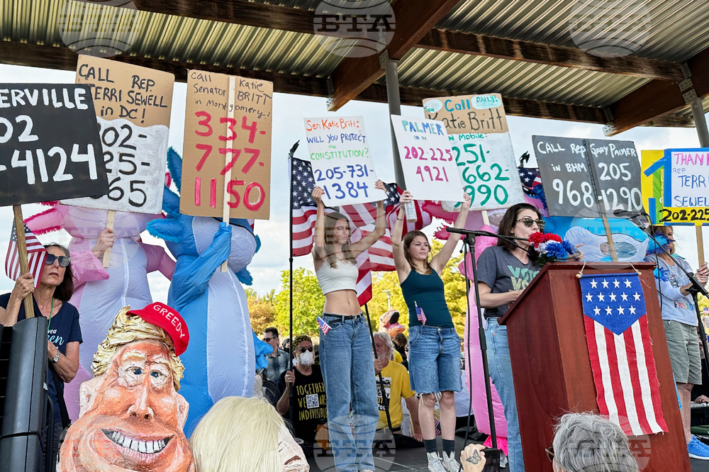 EDS NOTE: OBSCENITY - Protesters rally in Railroad Park in downtown Birmingham, Ala., for a No Kings protest of President Donald Trump's administration, Saturday, Oct. 18, 2025. (AP Photo/Bill Barrow)