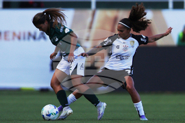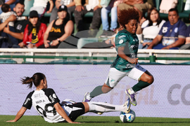 Angie Salazar of Colombia's Deportivo Cali and Gisela Robledo of Brazil's Corinthians battle for the ball during the Women’s Copa Libertadores final soccer match in Buenos Aires, Argentina, Saturday, Oct. 18, 2025. (AP Photo/Luciano Gonzalez)