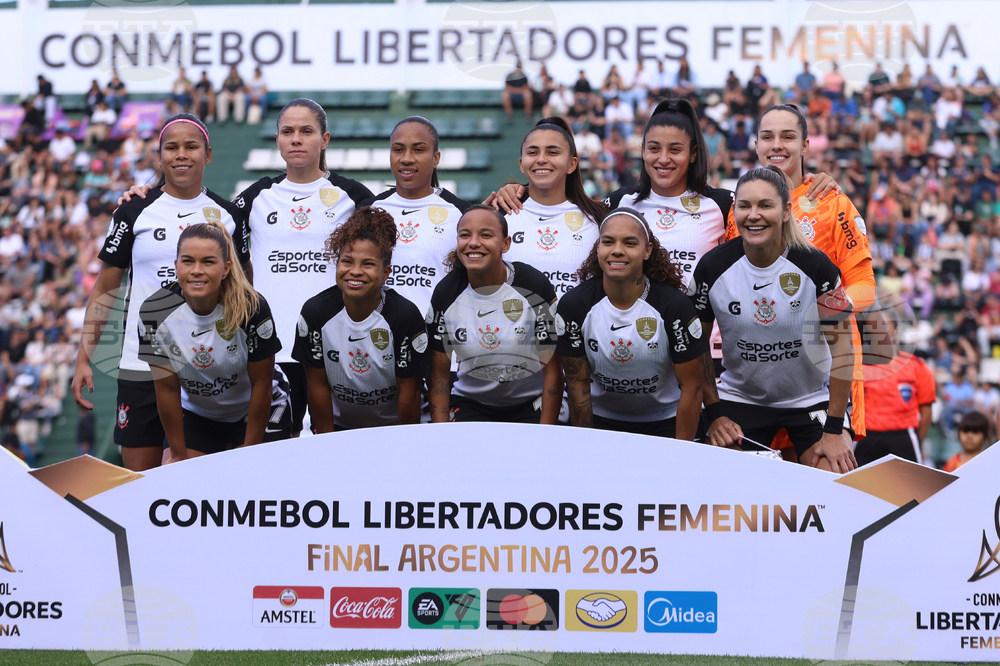 Players of Brazil's Corinthians pose for a team photo prior to the Copa Libertadores women final soccer match against Colombia's Deportivo Cali in Buenos Aires, Argentina, Saturday, Oct. 18, 2025. (AP Photo/Luciano Gonzalez)