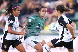 Mariza Nascimento of Brazil's Corinthians, left, and Leidy Cobos of Colombia's Deportivo Cali, center, battle for the ball during the Copa Libertadores women final soccer match in Buenos Aires, Argentina, Saturday, Oct. 18, 2025. (AP Photo/Luciano Gonzalez)