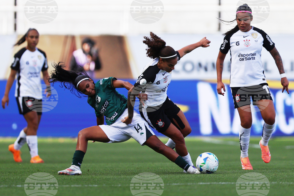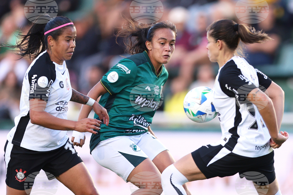 Players of Brazil's Corinthians pose for a team photo prior to the Women’s Copa Libertadores final soccer match against Colombia's Deportivo Cali in Buenos Aires, Argentina, Saturday, Oct. 18, 2025. (AP Photo/Luciano Gonzalez)