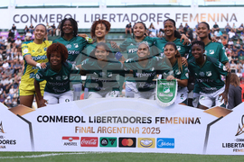 Players of Colombia's Deportivo Cali pose for a team photo prior to the Copa Libertadores women final soccer match against Brazil's Corinthians in Buenos Aires, Argentina, Saturday, Oct. 18, 2025. (AP Photo/Luciano Gonzalez)