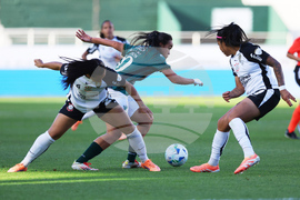 Victoria Albuquerque, left, and Erika Dos Santos, right, of Brazil's Corinthians fight for the ball with Leidy Cobos of Colombia's Deportivo Cali during the Women’s Copa Libertadores final soccer match in Buenos Aires, Argentina, Saturday, Oct. 18, 2025. (AP Photo/Luciano Gonzalez)