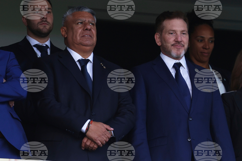 Claudio Tapia, president of Argentina's Soccer Association, left, and Conmebol President Alejandro Dominguez attend the Women’s Copa Libertadores final soccer match between Brazil's Corinthians and Colombia's Deportivo Cali in Buenos Aires, Argentina, Saturday, Oct. 18, 2025. (AP Photo/Luciano Gonzalez)