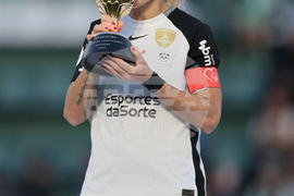 Gabriela Zanotti of Brazil's Corinthians celebrates with the trophy after defeating Colombia's Deportivo Cali and winning the Women's Copa Libertadores final soccer match in Buenos Aires, Argentina, Saturday, Oct. 18, 2025. (AP Photo/Luciano Gonzalez)