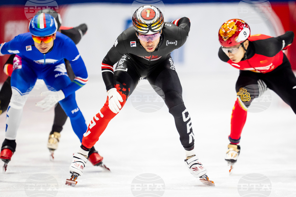 William Dandjinou, of Canada, center, is flanked by Pietro Sighel, of Italy, left, and Long Sun, of China, right, in the 500-meter race at the ISU Short Track World Tour speed skating event in Montreal on Saturday, Oct. 18, 2025. (Christopher Katsarov/The Canadian Press via AP)