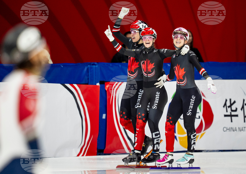 Courtney Sarault, left, celebrates with Kim Boutin, centre, and Danae Blais as team Canada finishes first in the 3000m relay race at the ISU Short Track World Tour speed skating event in Montreal on Saturday, Oct. 18, 2025. (Christopher Katsarov/The Canadian Press via AP)