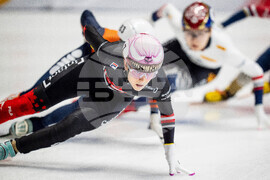 Florence Brunelle of Canada skates during the 3000m relay race at the ISU Short Track World Tour speed skating event in Montreal on Saturday, Oct. 18, 2025. (Christopher Katsarov/The Canadian Press via AP)