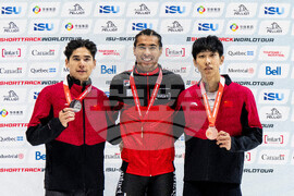 Gold medalist William Dandjinou of Canada, centre, poses for a photograph with silver medalist Shaoang Liu of China, left, and bronze medalist Long Sun of China following the 500m race at the ISU Short Track World Tour speed skating event in Montreal on Saturday, Oct. 18, 2025. (Christopher Katsarov/The Canadian Press via AP)