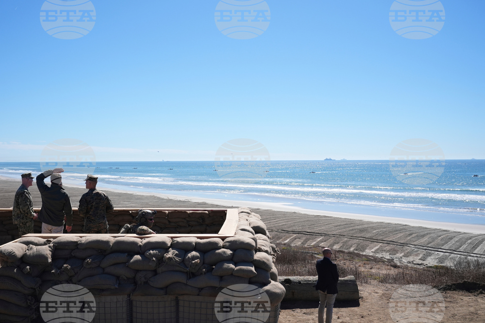 Vice President JD Vance, center, participates in a briefing during an amphibious capabilities demonstration on Red Beach at Camp Pendleton, Calif., Saturday, Oct. 18, 2025, as part of the Marine Corps' 250th anniversary celebrations. (Oliver Contreras/Pool Photo via AP)