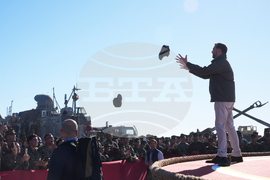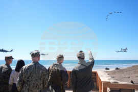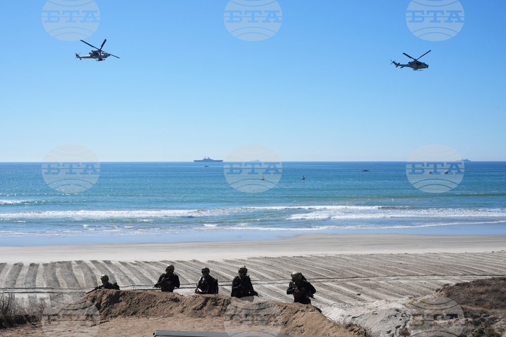 Marines perform in a demonstration with hovercraft and the amphibious assault ship USS Boxer as Vice President JD Vance, not pictured, watches during activities to mark the upcoming Marine Corps' 250th anniversary Saturday, Oct 18, 2025, on Marine Corps Base Camp Pendleton in Camp Pendleton, Calif. (AP Photo/Gregory Bull)