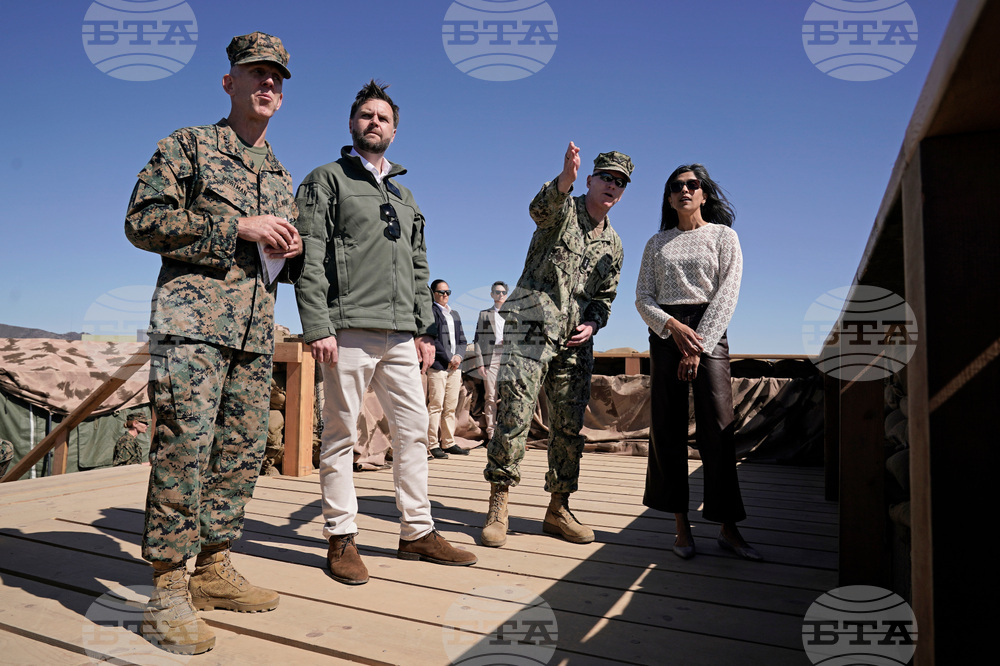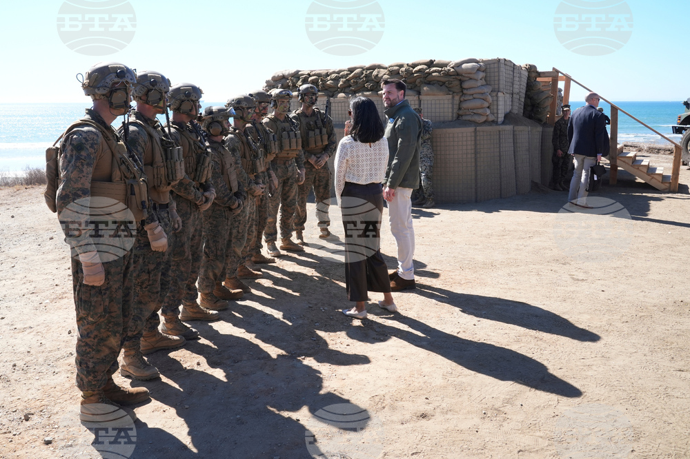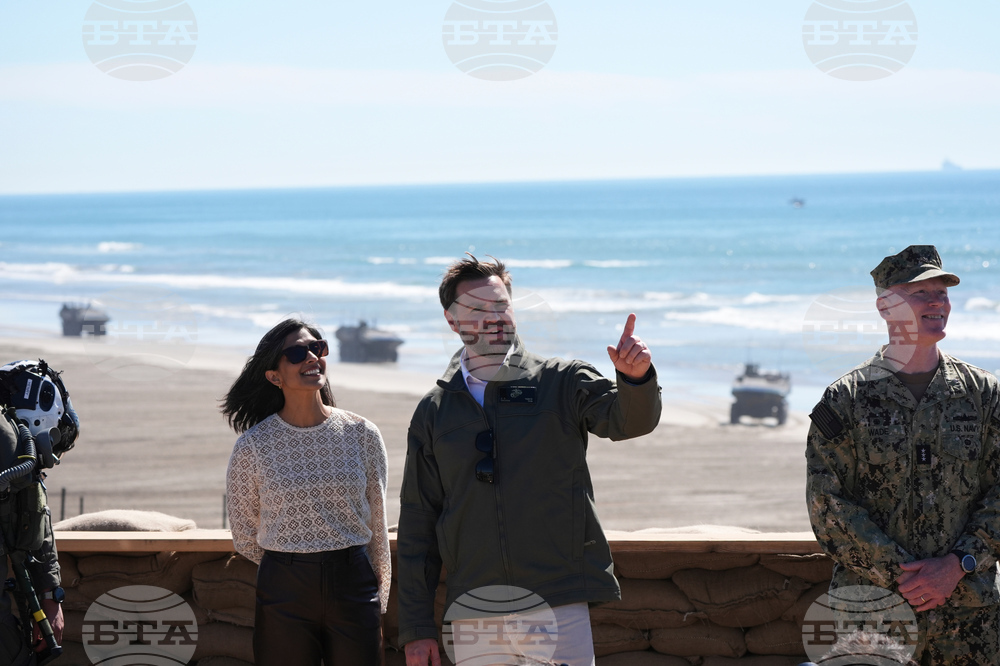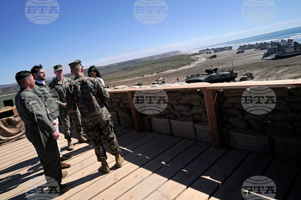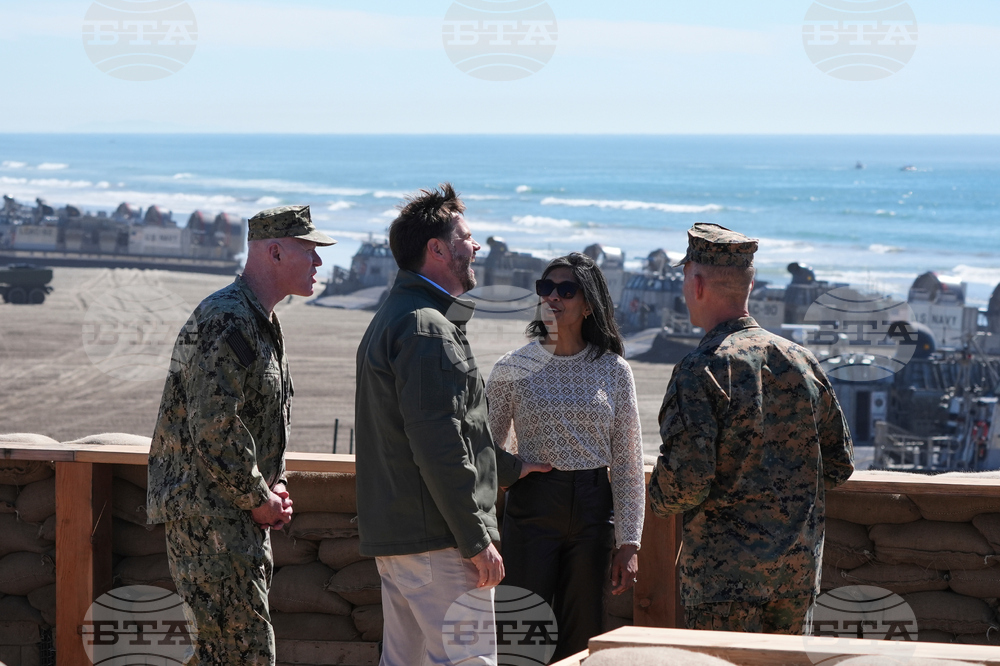 Vice President JD Vance, center, and second lady Usha Vance, second left, participate in a briefing during an amphibious capabilities demonstration on Red Beach at Camp Pendleton, Calif., Saturday, Oct. 18, 2025, as part of the Marine Corps' 250th anniversary celebrations. (Oliver Contreras/Pool Photo via AP)