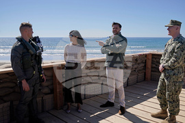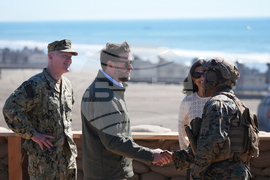 Vice President JD Vance, center right, and second lady Usha Vance, center left, participate in a briefing during an amphibious capabilities demonstration on Red Beach at Camp Pendleton, Calif., Saturday, Oct. 18, 2025, as part of the Marine Corps' 250th anniversary celebrations. (Oliver Contreras/Pool Photo via AP)