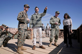 Vice President JD Vance, standing second left, and second lady Usha Vance, right, participate in a briefing during an amphibious capabilities demonstration on Red Beach at Camp Pendleton, Calif., Saturday, Oct. 18, 2025, as part of the Marine Corps' 250th anniversary celebrations. (Oliver Contreras/Pool Photo via AP)