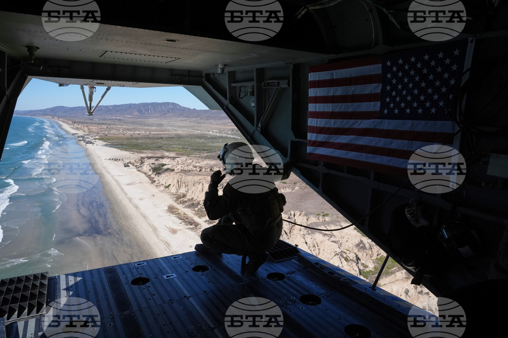 A Marines is pictured in a helicopter during a demonstration to mark the upcoming Marine Corps' 250th anniversary Saturday, Oct 18, 2025, on Marine Corps Base Camp Pendleton in Camp Pendleton, Calif. (AP Photo/Gregory Bull)