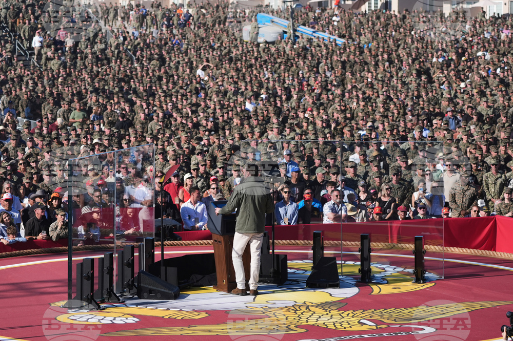 Defense Secretary Pete Hegseth speaks during activities to mark the upcoming Marine Corps' 250th anniversary Saturday, Oct 18, 2025, on Marine Corps Base Camp Pendleton in Camp Pendleton, Calif. (AP Photo/Gregory Bull)