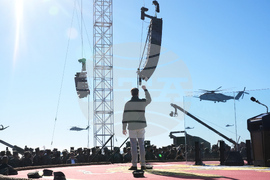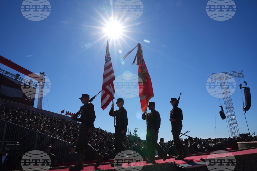 An military color guard arrives during an event with Vice President JD Vance and Defense Secretary Pete Hegseth to mark the upcoming Marine Corps' 250th anniversary Saturday, Oct 18, 2025, on Marine Corps Base Camp Pendleton in Camp Pendleton, Calif. (AP Photo/Gregory Bull)