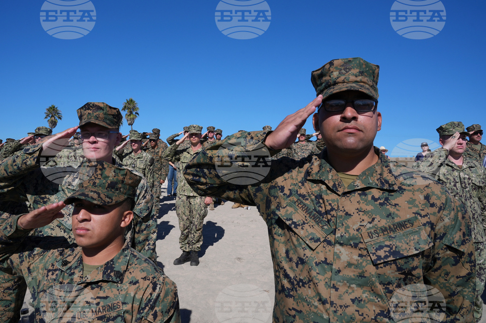 Marines stand and salute during the singing of the national anthem at an event with Vice President JD Vance and Defense Secretary Pete Hegseth to mark the upcoming Marine Corps' 250th anniversary Saturday, Oct 18, 2025, on Marine Corps Base Camp Pendleton in Camp Pendleton, Calif. (AP Photo/Gregory Bull)