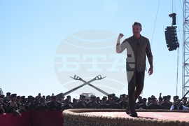 Vice President JD Vance, fourth from right on the platform, watches a demonstration by Marines during activities to mark the upcoming Marine Corps' 250th anniversary Saturday, Oct 18, 2025, on Marine Corps Base Camp Pendleton in Camp Pendleton, Calif. (AP Photo/Gregory Bull)