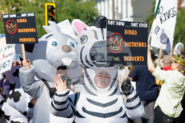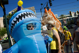 Demonstrators, dressed in inflatable animal costumes, cross Las Vegas Boulevard during a "No Kings" protest in downtown Las Vegas Saturday, Oct. 18, 2025. (Steve Marcus/Las Vegas Sun via AP)