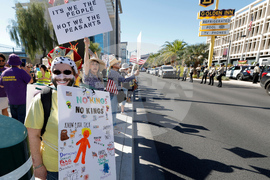 Demonstrators march down the sidewalk along Las Vegas Boulevard during a "No Kings" protest in downtown Las Vegas Saturday, Oct. 18, 2025. (Steve Marcus /Las Vegas Sun via AP)