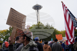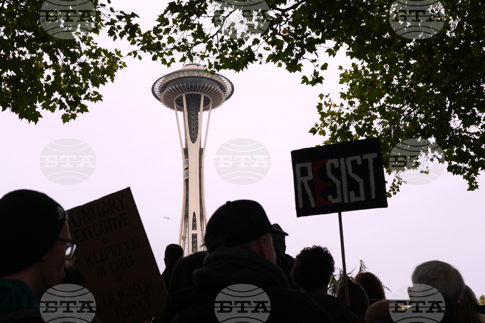 The Space Needle is seen as people take part in a "No Kings" protest Saturday, Oct. 18, 2025, in Seattle. (AP Photo/Lindsey Wasson)