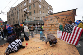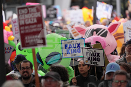 A protester dressed as President Donald Trump is escorted in chains by others dressed as police as people march during a "No Kings" protest Saturday, Oct. 18, 2025, in Seattle. (AP Photo/Lindsey Wasson)