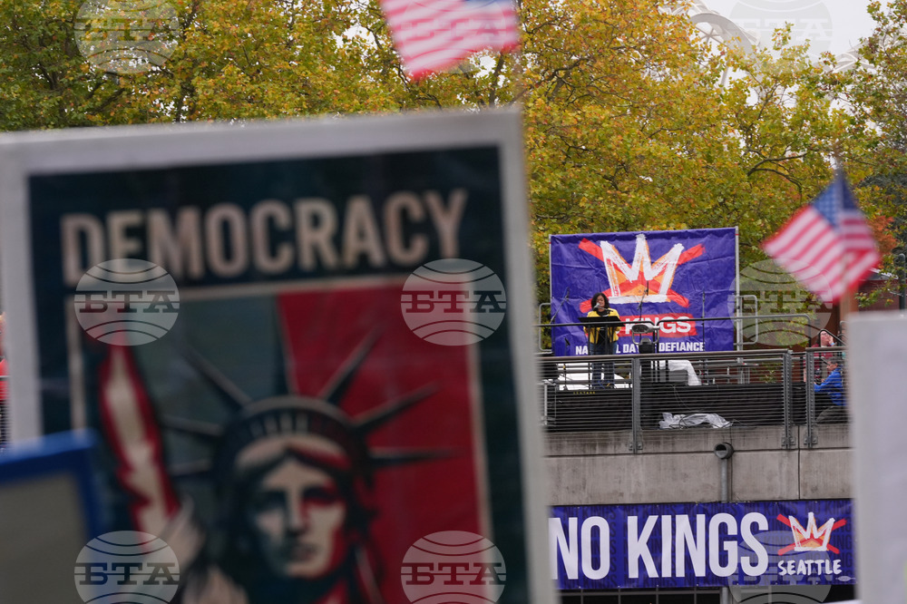People take part in a "No Kings" protest Saturday, Oct. 18, 2025, in Seattle. (AP Photo/Lindsey Wasson)