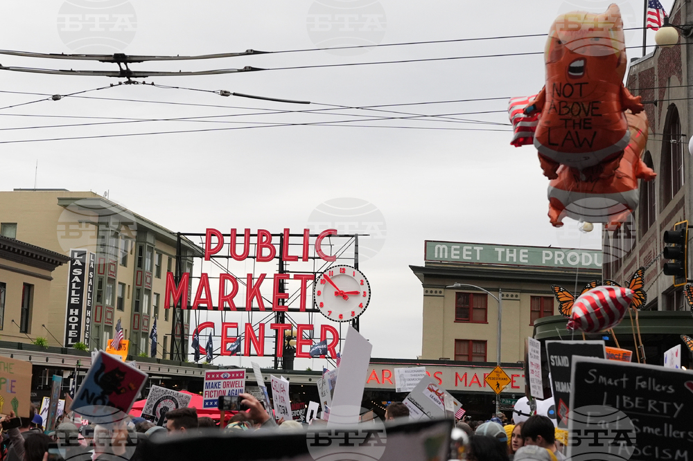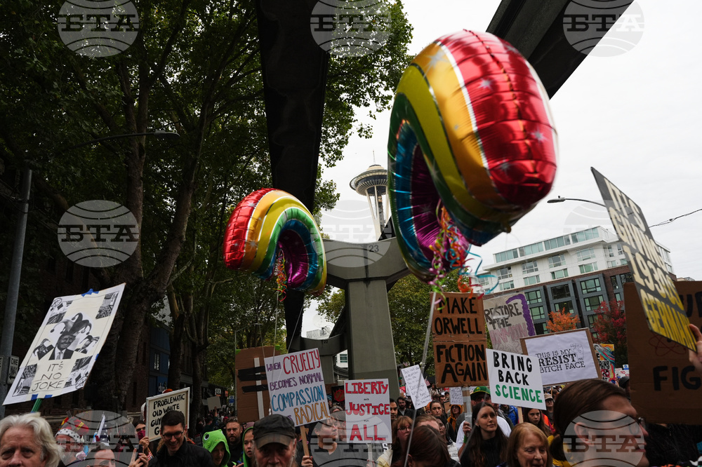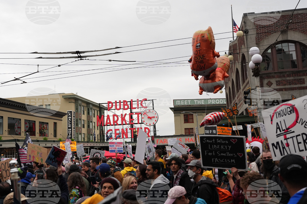 Balloons fly as people take part in a "No Kings" protest Saturday, Oct. 18, 2025, in Seattle. (AP Photo/Lindsey Wasson)