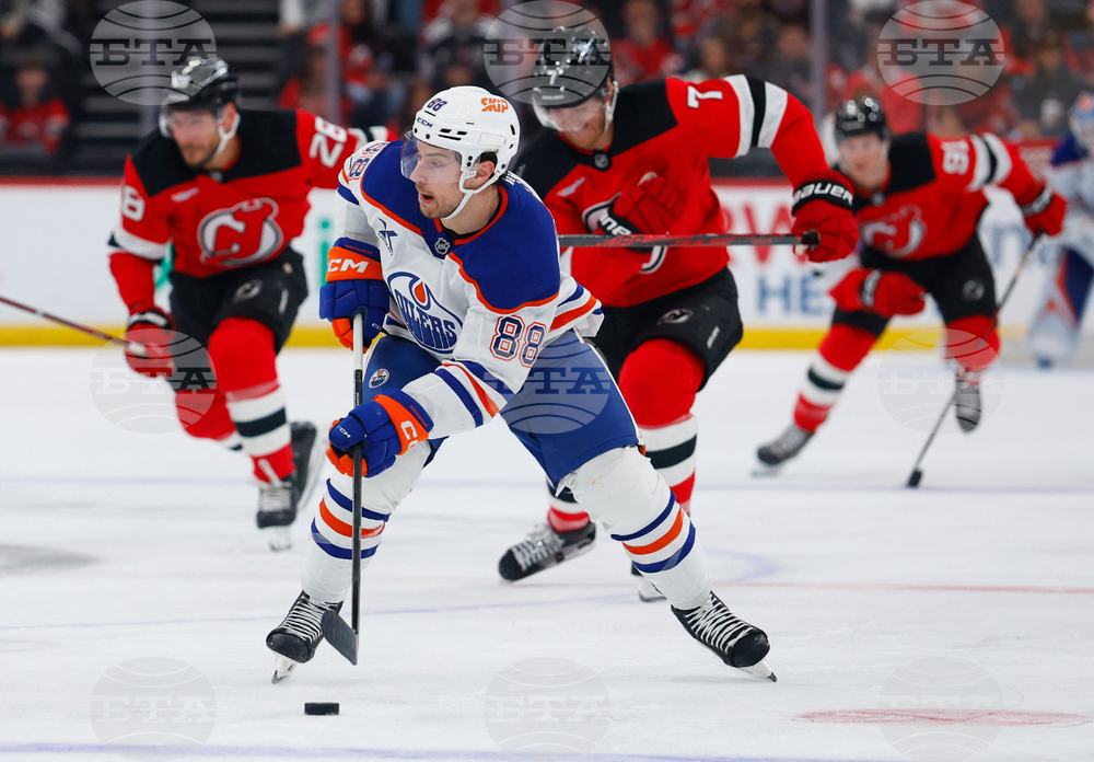 Edmonton Oilers left wing Andrew Mangiapane (88) skates with the puck against the New Jersey Devils during the first period of an NHL hockey game, Saturday, Oct. 18, 2024, in Newark, N.J. (AP Photo/Noah K. Murray)