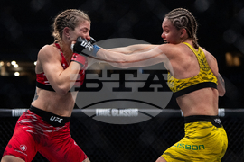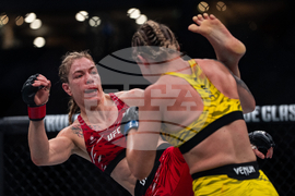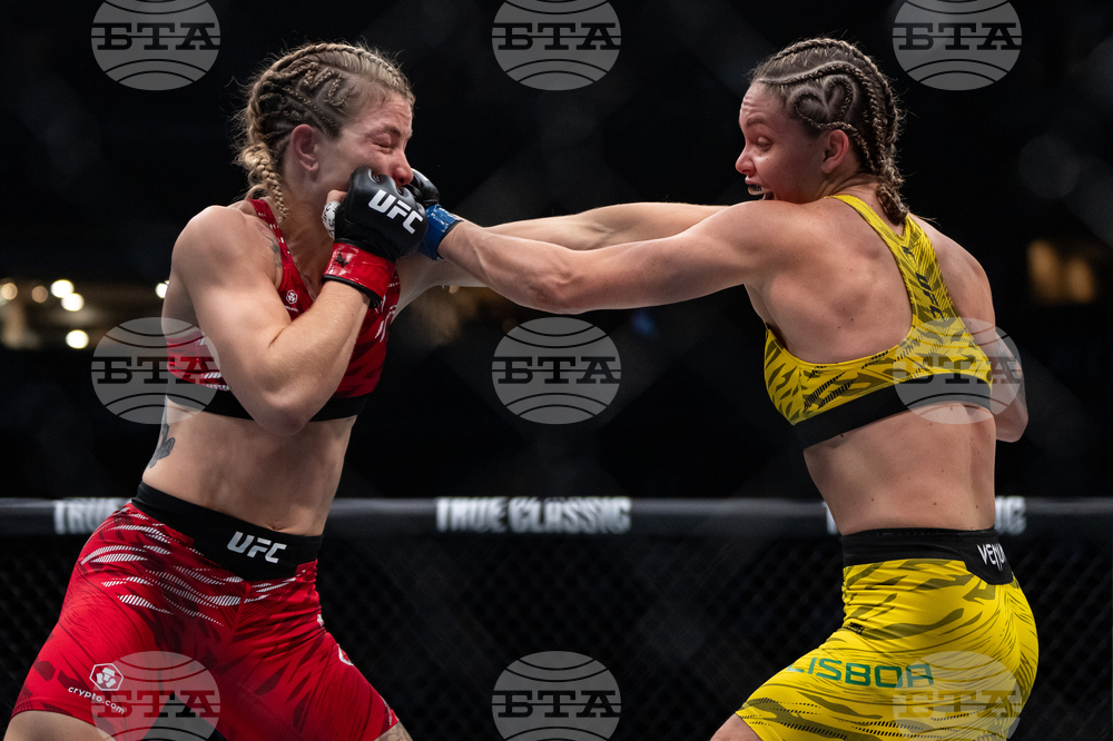 Tainara Lisboa, right, lands a punch to Melissa Croden's face during a women's bantamweight bout at a UFC Fight Night mixed martial arts bout in Vancouver, British Columbia, Saturday, Oct. 18, 2025. (Ethan Cairns/The Canadian Press via AP)