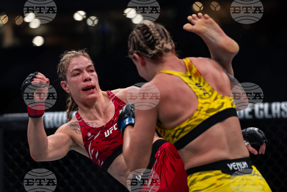 Melissa Croden, left, punches Tainara Lisboa, right, during a women's bantamweight bout at a UFC Fight Night mixed martial arts bout in Vancouver, British Columbia, Saturday, Oct. 18, 2025. (Ethan Cairns/The Canadian Press via AP)