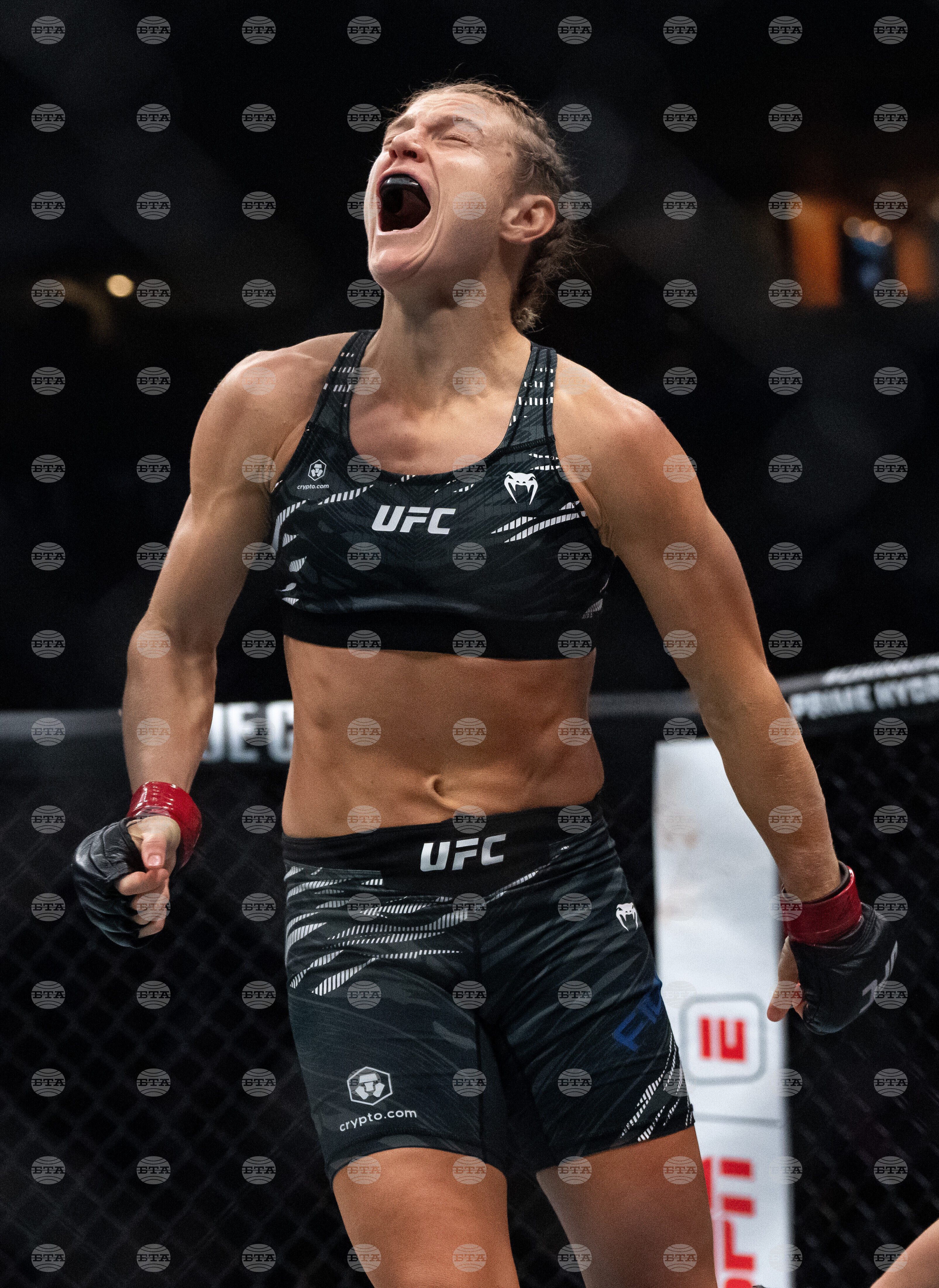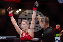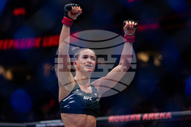 Stephanie Luciano celebrates after defeating Ravena Oliveira in a women's strawweight mixed martial arts bout at a UFC Fight Night in Vancouver, British Columbia, Saturday, Oct. 18, 2025. (Ethan Cairns/The Canadian Press via AP)