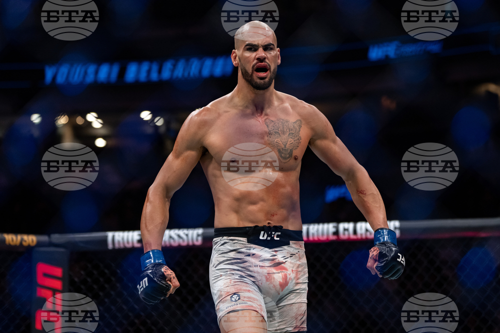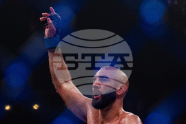 Yousri Belgaroui celebrates after defeating Azamat Bekoev in a middleweight mixed martial arts bout at a UFC Fight Night in Vancouver, British Columbia, Saturday, Oct. 18, 2025. (Ethan Cairns/The Canadian Press via AP)