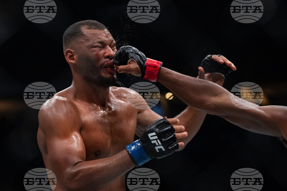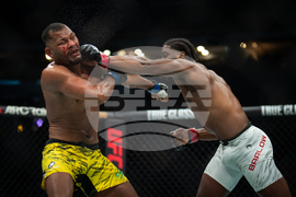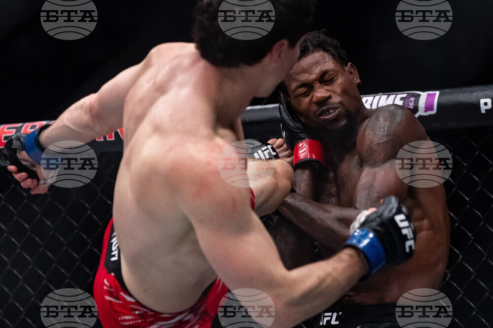Charles Jourdain, top, of Canada, punches Davey Grant during their bantamweight bout at a UFC Fight Night in Vancouver, on Saturday, Oct. 18, 2025. (Ethan Cairns/The Canadian Press via AP)