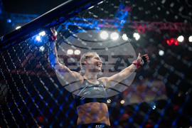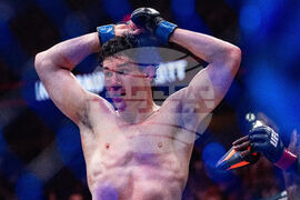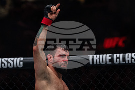 Brendan Allen celebrates after defeating Reinier de Ridder in a middleweight mixed martial arts bout at a UFC Fight Night in Vancouver, British Columbia, Saturday, Oct. 18, 2025. (Ethan Cairns/The Canadian Press via AP)