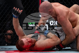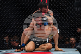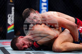 Kyle Nelson, top, of Canada, and Matt Frevola, bottom, fight during a lightweight mixed martial arts bout at a UFC Fight Night in Vancouver, British Columbia, Saturday, Oct. 18, 2025. (Ethan Cairns/The Canadian Press via AP)