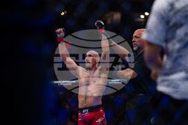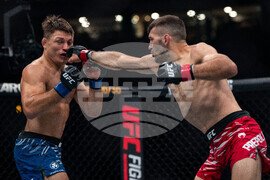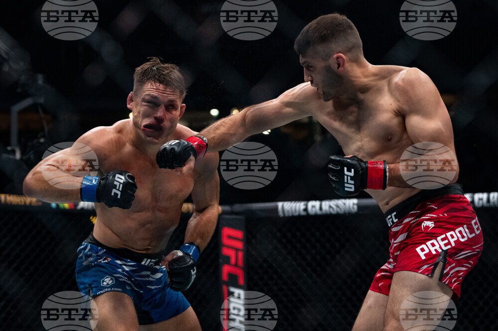 Kyle Prepolec, left, of Canada, and Drew Dober, right, fight during a lightweight mixed martial arts bout at a UFC Fight Night in Vancouver, British Columbia, Saturday, Oct. 18, 2025. (Ethan Cairns/The Canadian Press via AP)