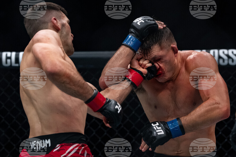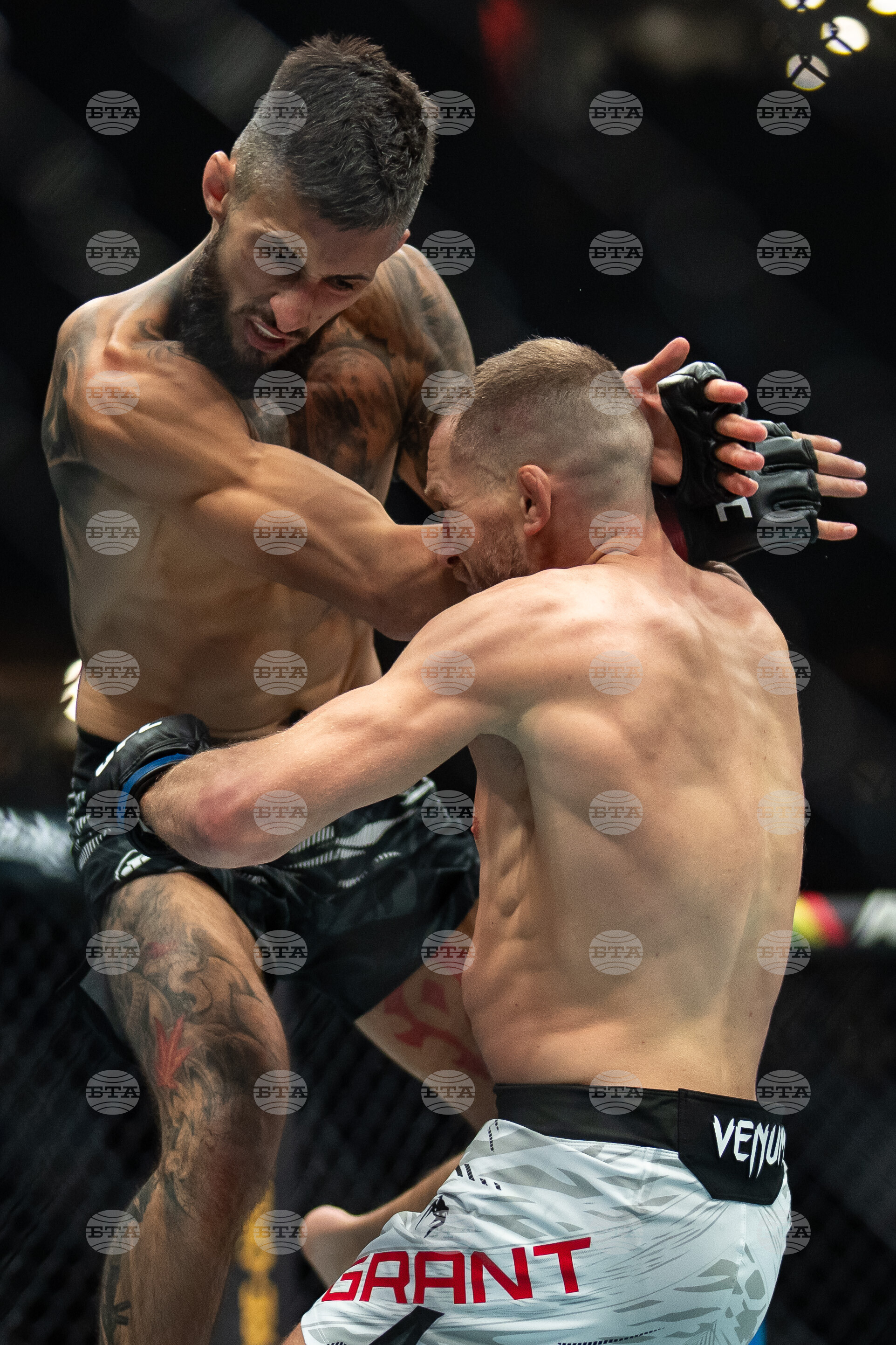 Drew Dober, left and Kyle Prepolec, of Canada, fight during their lightweight bout at a UFC Fight Night in Vancouver on Saturday, Oct. 18, 2025. (Ethan Cairns/The Canadian Press via AP)
