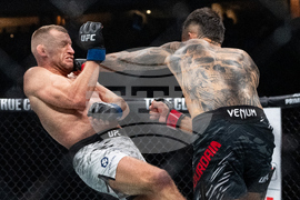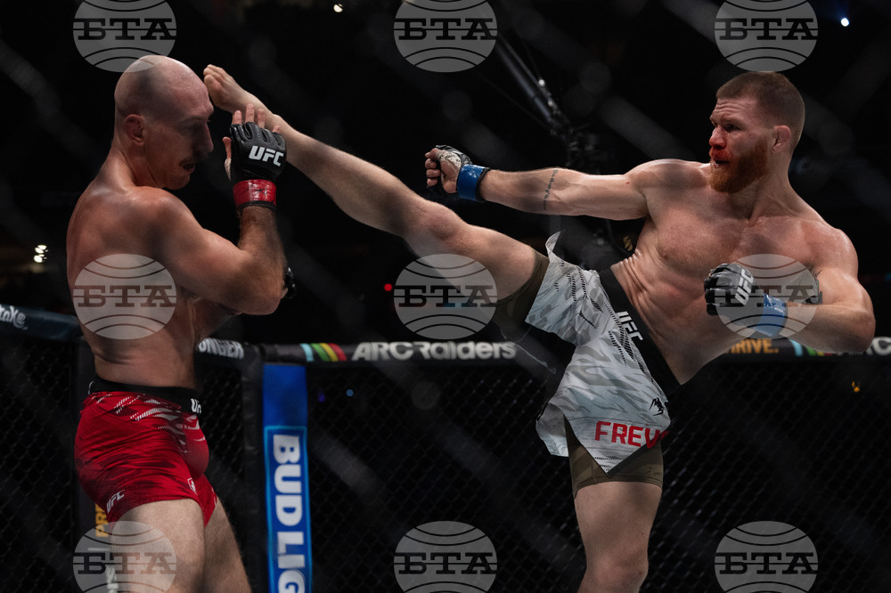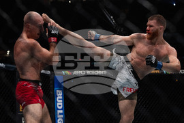 Kyle Nelson, left, of Canada, kicks Matt Frevola, right, during a lightweight mixed martial arts bout at a UFC Fight Night in Vancouver, British Columbia, Saturday, Oct. 18, 2025. (Ethan Cairns/The Canadian Press via AP)