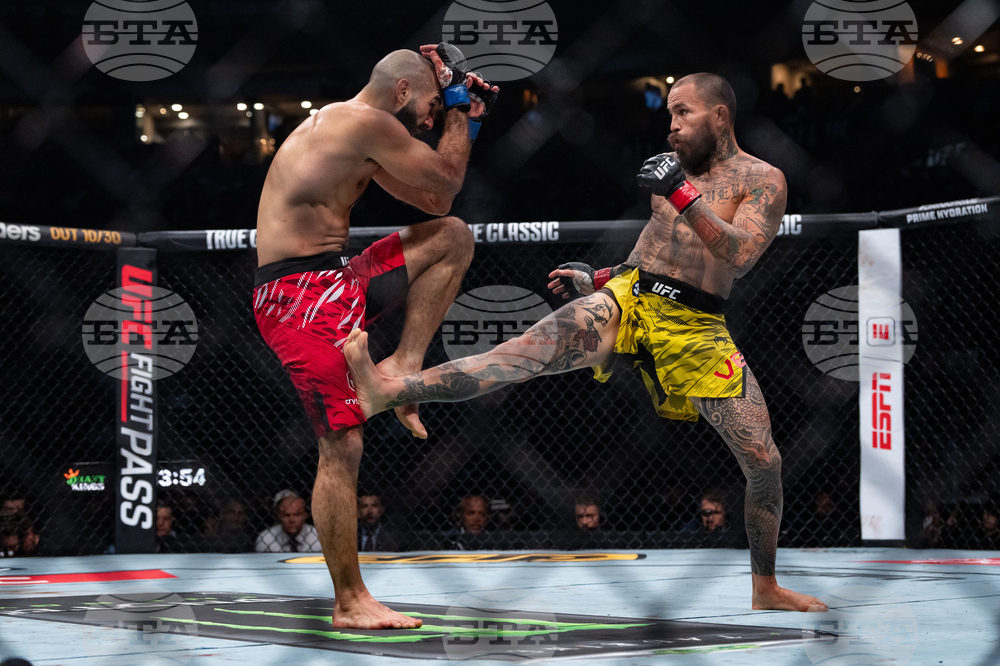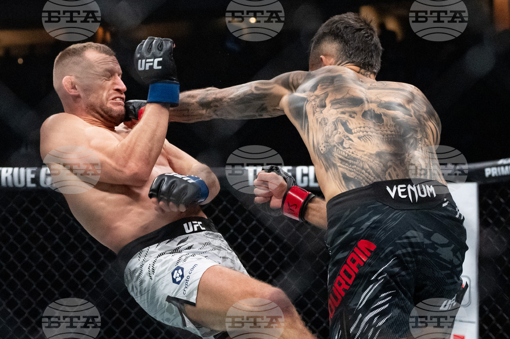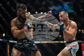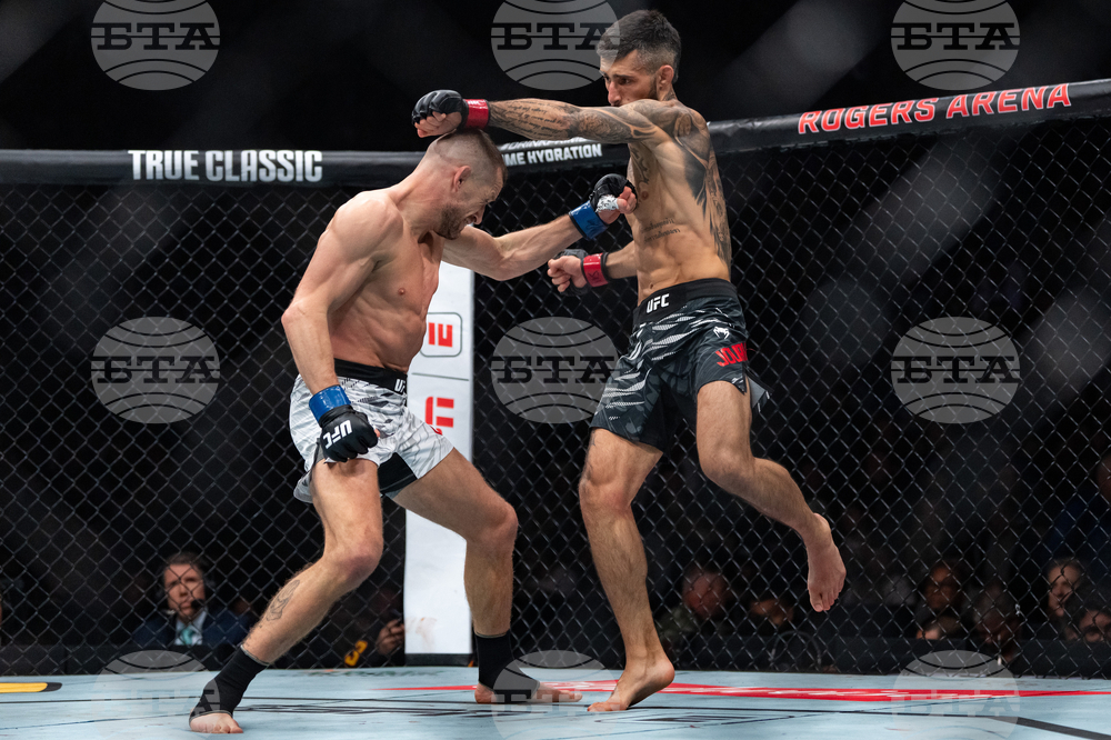Aiemann Zahabi, left, and Marlon Vera, right, fight during a bantamweight mixed martial arts bout at a UFC Fight Night in Vancouver, British Columbia, Saturday, Oct. 18, 2025. (Ethan Cairns/The Canadian Press via AP)