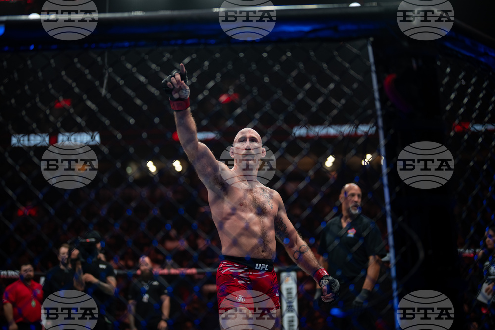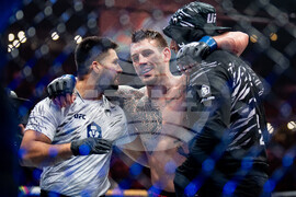 Brendan Allen, center, celebrates after defeating Reinier de Ridder in a middleweight mixed martial arts bout at a UFC Fight Night in Vancouver, British Columbia, Saturday, Oct. 18, 2025. (Ethan Cairns/The Canadian Press via AP)