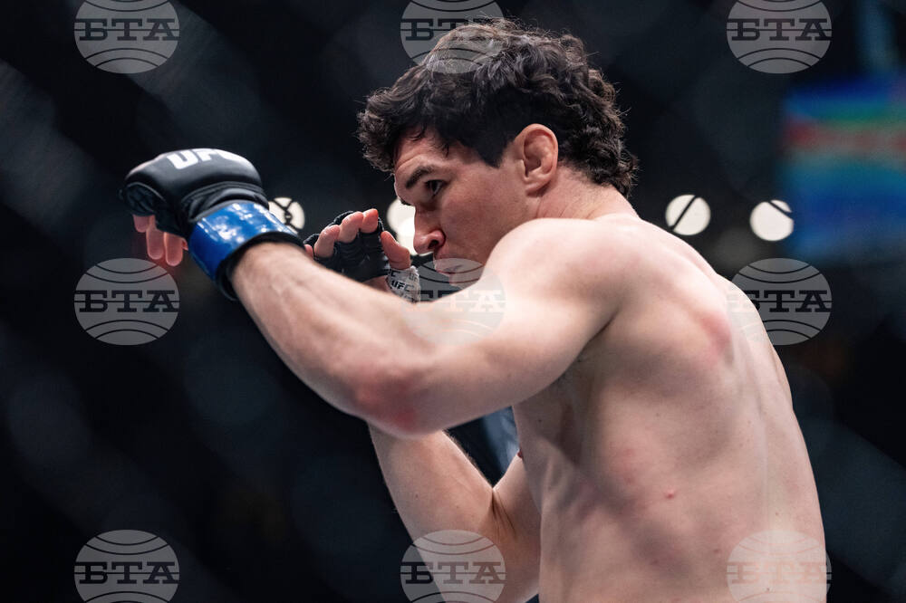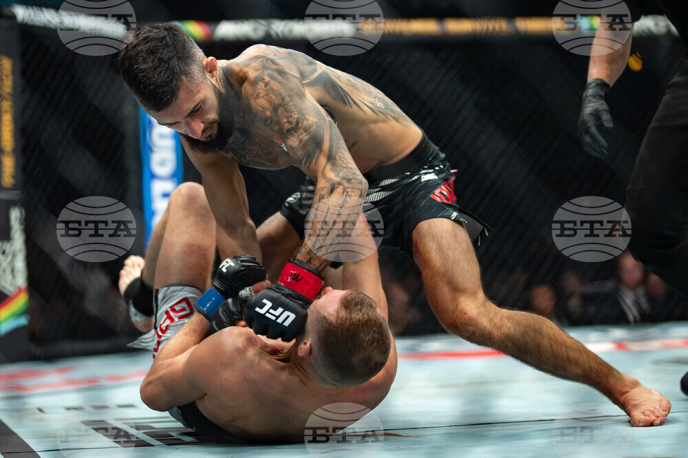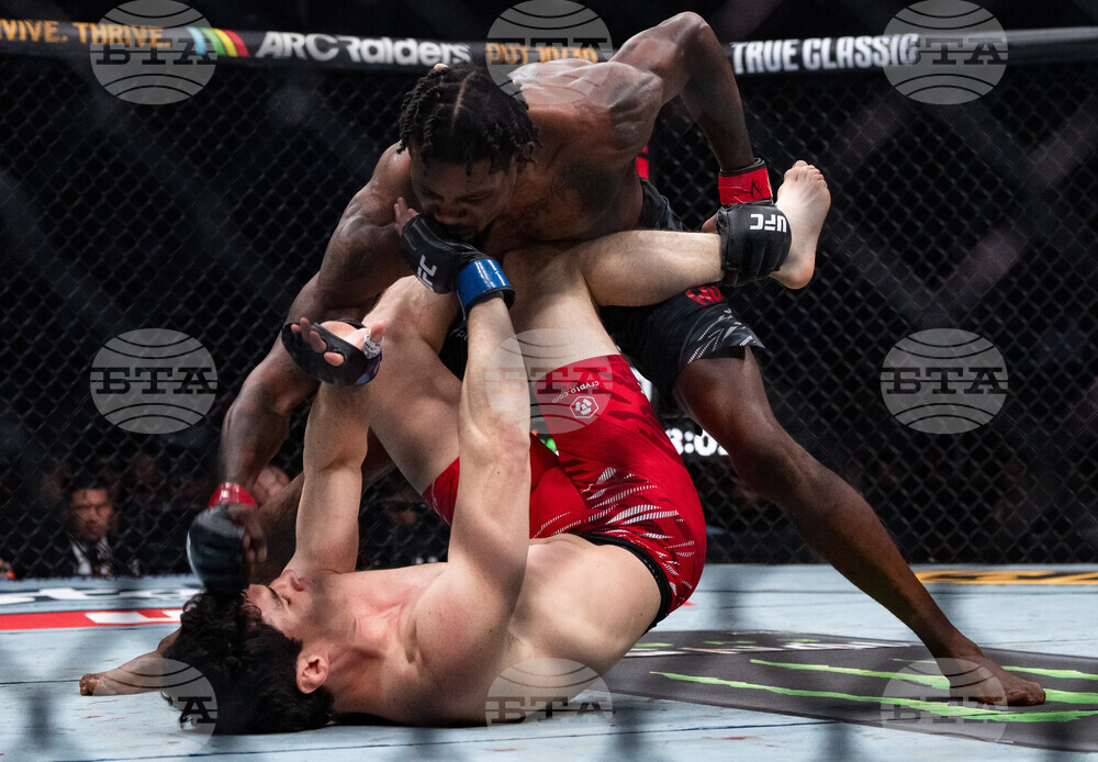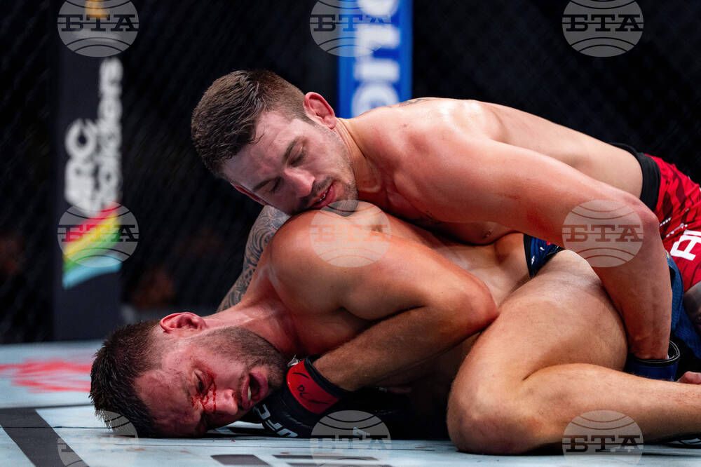 Brendan Allen, top, pins Reinier de Ridder, bottom, during a middleweight mixed martial arts bout at a UFC Fight Night in Vancouver, British Columbia, Saturday, Oct. 18, 2025. (Ethan Cairns/The Canadian Press via AP)