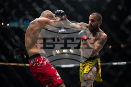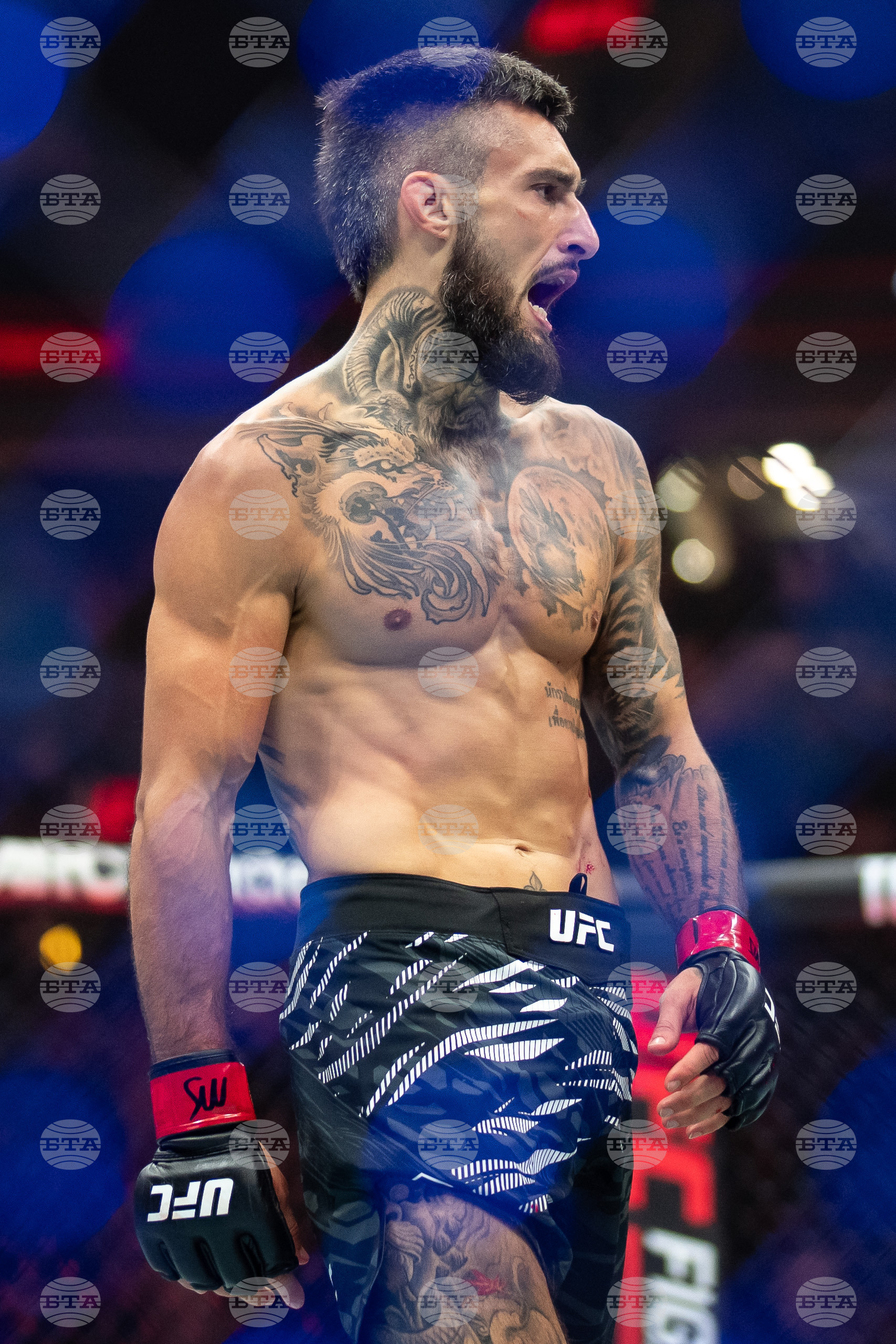 Aiemann Zahabi, left, and Marlon Vera fight during a bantamweight mixed martial arts bout at a UFC Fight Night in Vancouver, British Columbia, Saturday, Oct. 18, 2025. (Ethan Cairns/The Canadian Press via AP)