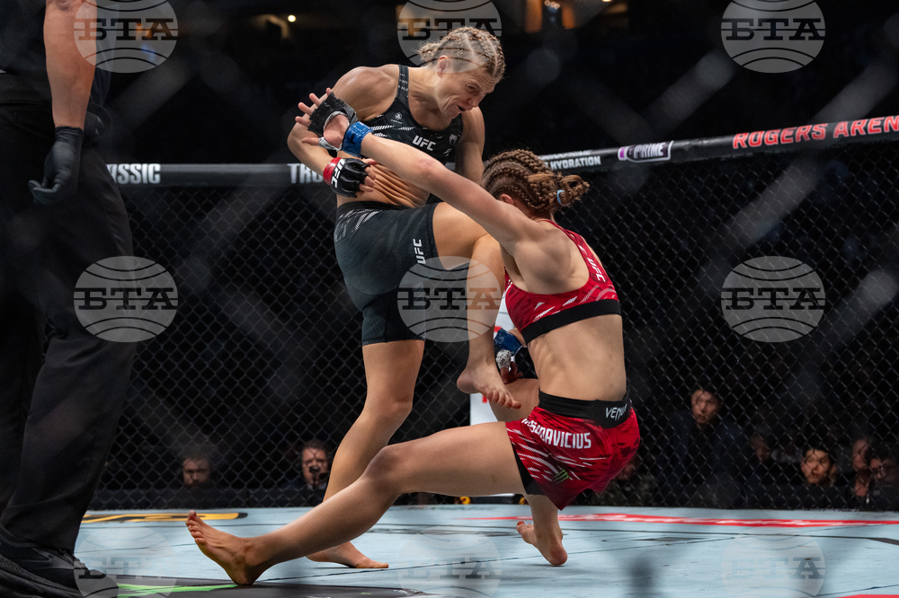Melissa Croden, left, kicks Tainara Lisboa, right, during a women's bantamweight mixed martial arts bout at a UFC Fight Night in Vancouver, British Columbia, Saturday, Oct. 18, 2025. (Ethan Cairns/The Canadian Press via AP)