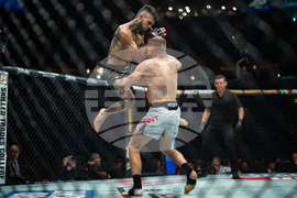 Kevin Holland, top, strikes Mike Malott, bottom, during a welterweight mixed martial arts bout at a UFC Fight Night in Vancouver, British Columbia, Saturday, Oct. 18, 2025. (Ethan Cairns/The Canadian Press via AP)