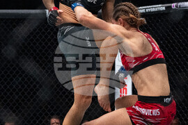 Manon Fiorot, of France, top, punches Jasmine Jasudavicius, of Canada during their women's flyweight bout at a UFC Fight Night in Vancouver, on Saturday, Oct. 18, 2025. (Ethan Cairns/The Canadian Press via AP)