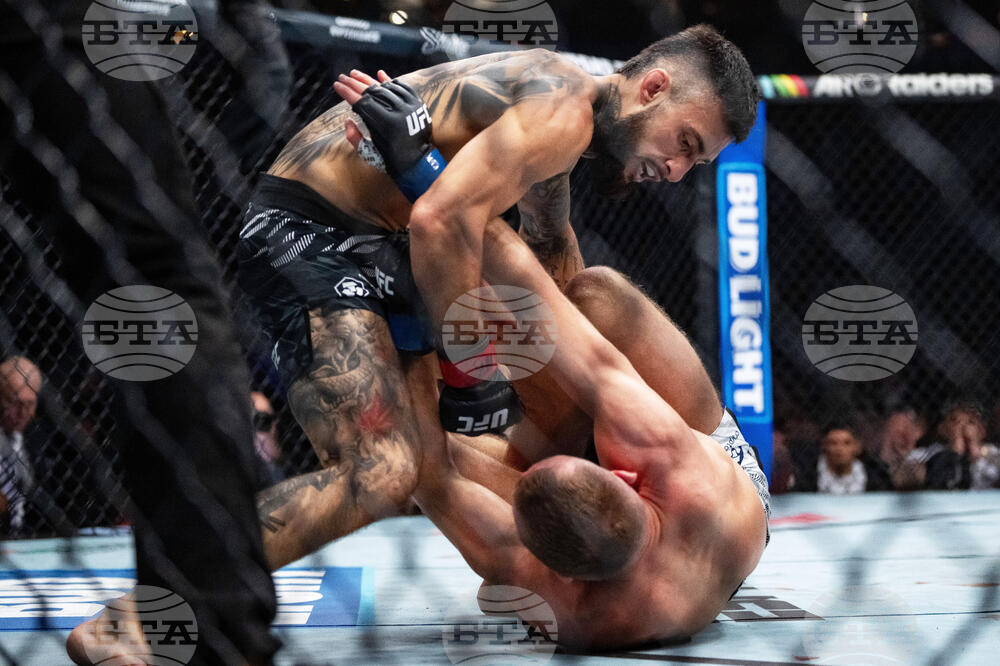 Kyle Nelson, top, of Canada, and Matt Frevola, right, fight during a lightweight mixed martial arts bout at a UFC Fight Night in Vancouver, British Columbia, Saturday, Oct. 18, 2025. (Ethan Cairns/The Canadian Press via AP)